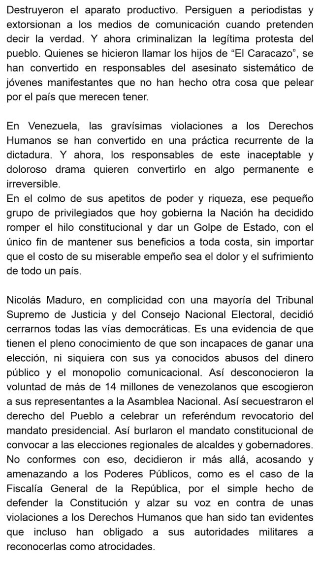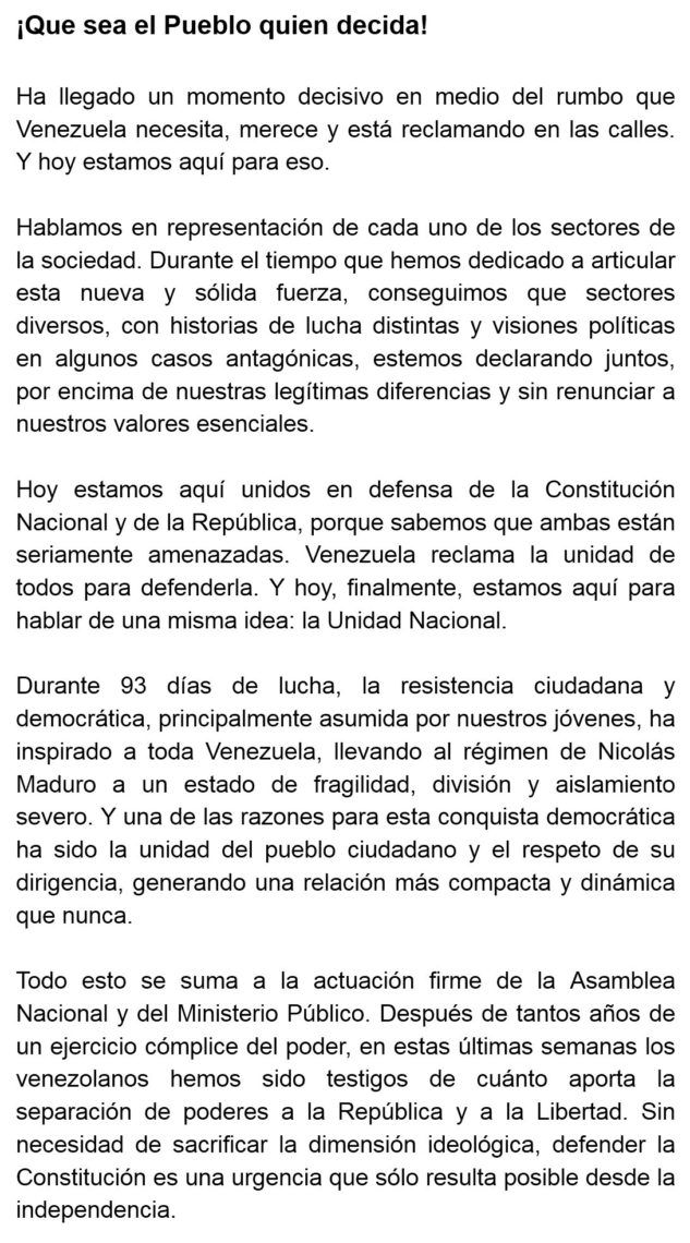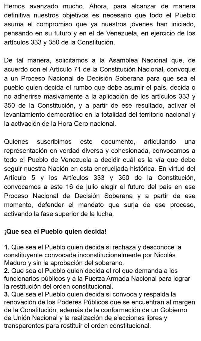Por ello la MUD solicitó a la Asamblea Nacional que, de acuerdo con lo establecido en el artículo 71 de la Constitución, «convoque a un Proceso Nacional de Decisión Soberana para que sea el pueblo quien decida el rumbo que debe asumir el país, decida o no adherirse masivamente a la aplicación de los artículos 333 y 350 de la Constitución, y a partir de ese resultado, activar el levantamiento democrático en la totalidad del territorio nacional y la activación de la Hora Cero nacional».