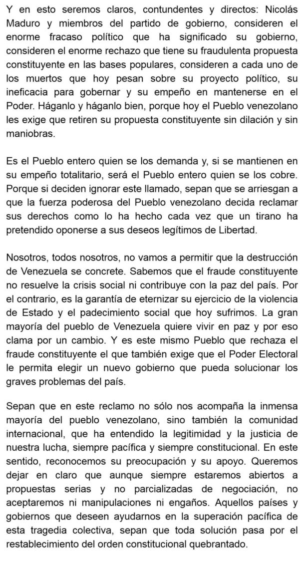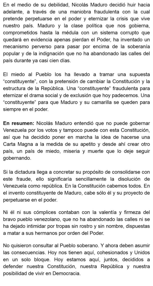 La Mesa de la Unidad Democrática (MUD) convocó a un plebiscito ciudadano contra la Asamblea Nacional Constituyente (ANC), ya que aseguran a través de un documento que «si la dictadura llega a concretar su propósito de consolidarse con este fraude, ello significaría sencillamente la disolución de Venezuela como república».