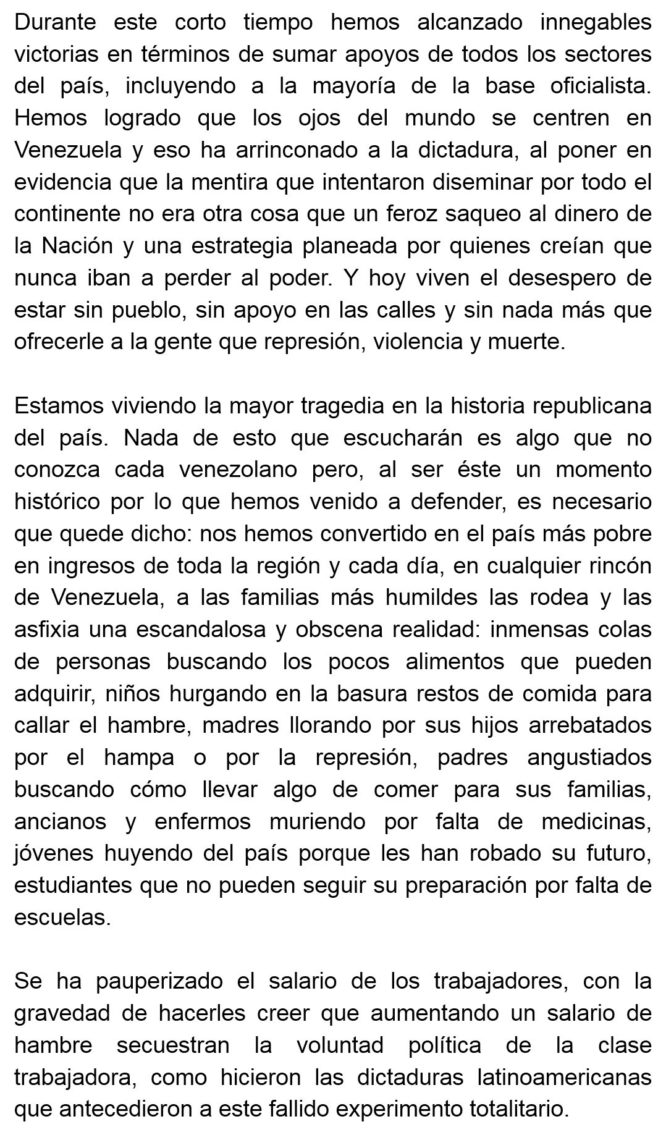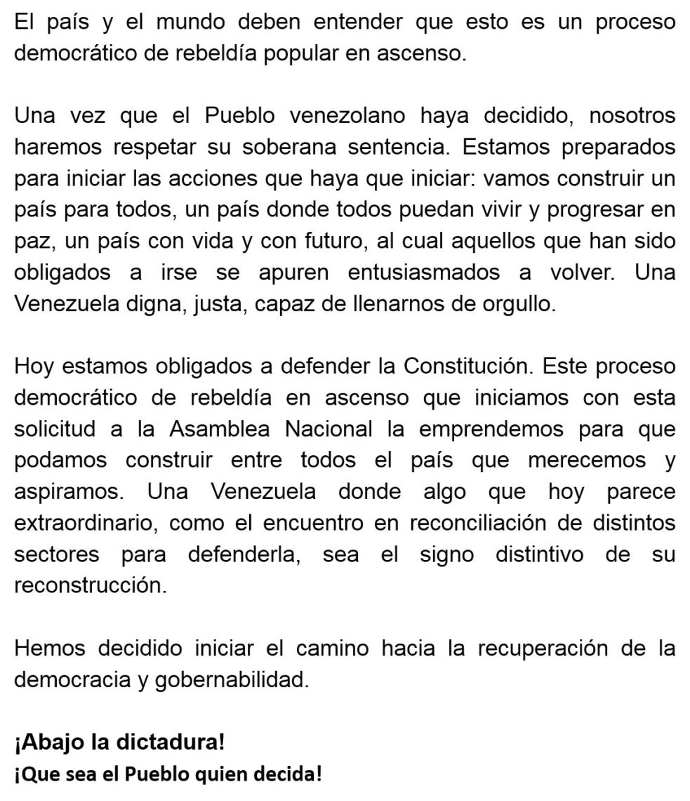 Por ello la MUD solicitó a la Asamblea Nacional que, de acuerdo con lo establecido en el artículo 71 de la Constitución, «convoque a un Proceso Nacional de Decisión Soberana para que sea el pueblo quien decida el rumbo que debe asumir el país, decida o no adherirse masivamente a la aplicación de los artículos 333 y 350 de la Constitución, y a partir de ese resultado, activar el levantamiento democrático en la totalidad del territorio nacional y la activación de la Hora Cero nacional».
